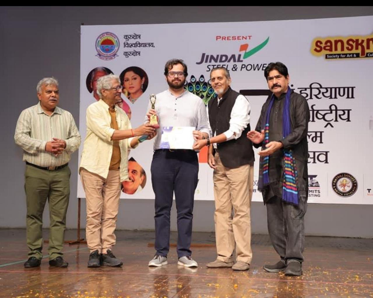 Pavitra Verma receiving the Best Film (Jury) Award for IPSA by Dharmendra Dhangi (far left) Rajendra Gupta (left), Shishir Sharma (right), Yashpal Sharma (far right) at the 7th Haryana International Film Festival, Kurukshetra University
