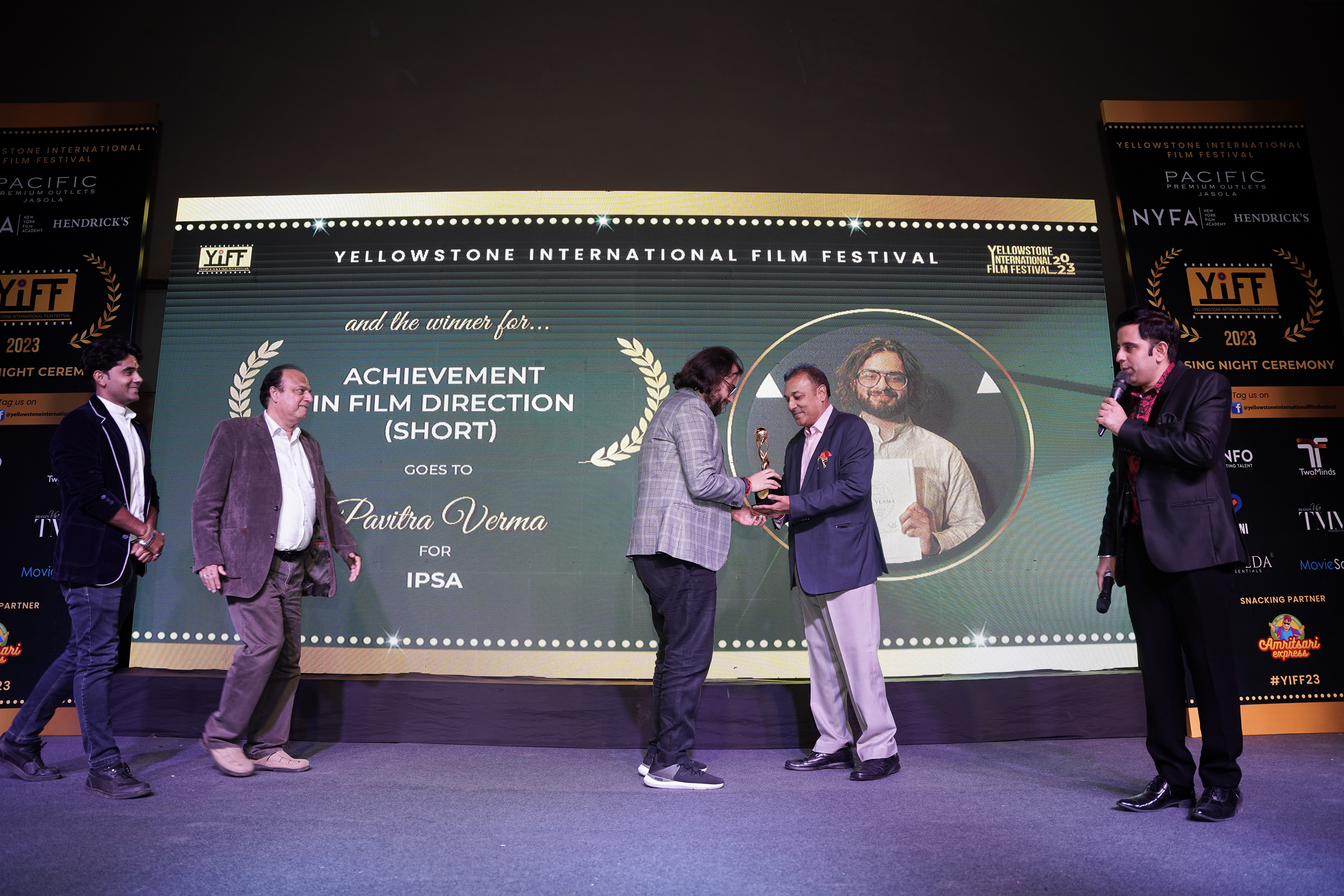 Pavitra Verma receiving the Achievement in Film Direction (Short) award for IPSA with Anil Kumar (left) and Hitesh Sharma (far left) at the Yellowstone Film Festival 2023, New Delhi